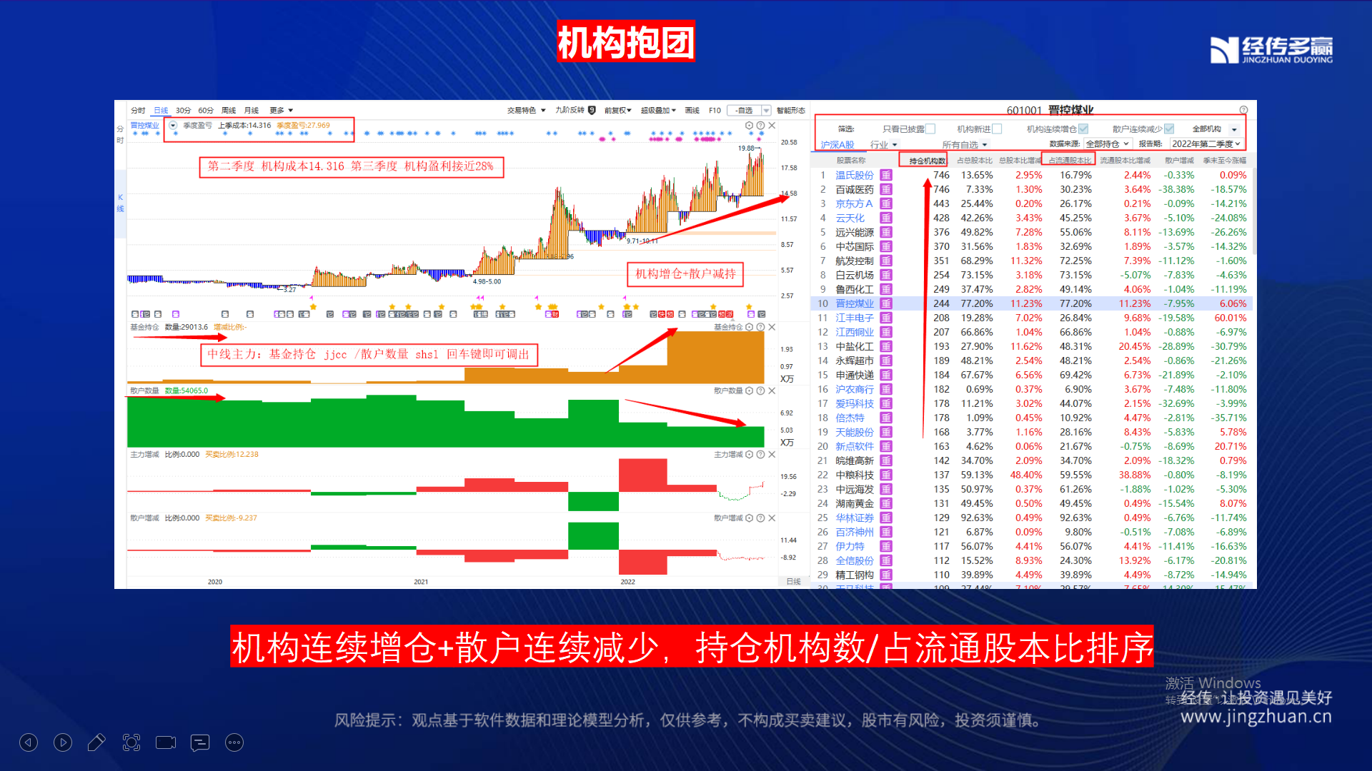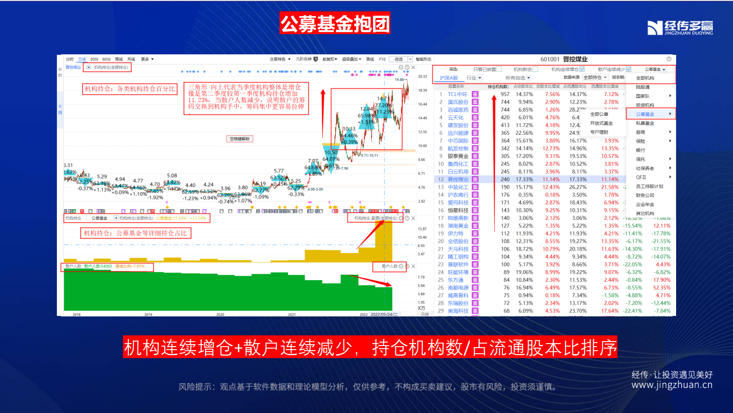 从机构分析本质上,基金增仓且散户减少,主力建仓个股,咱们利用多头增强策略,挑选趋势和资金启动的跟踪操作,站在主力的肩膀上,让利润跑动起来!