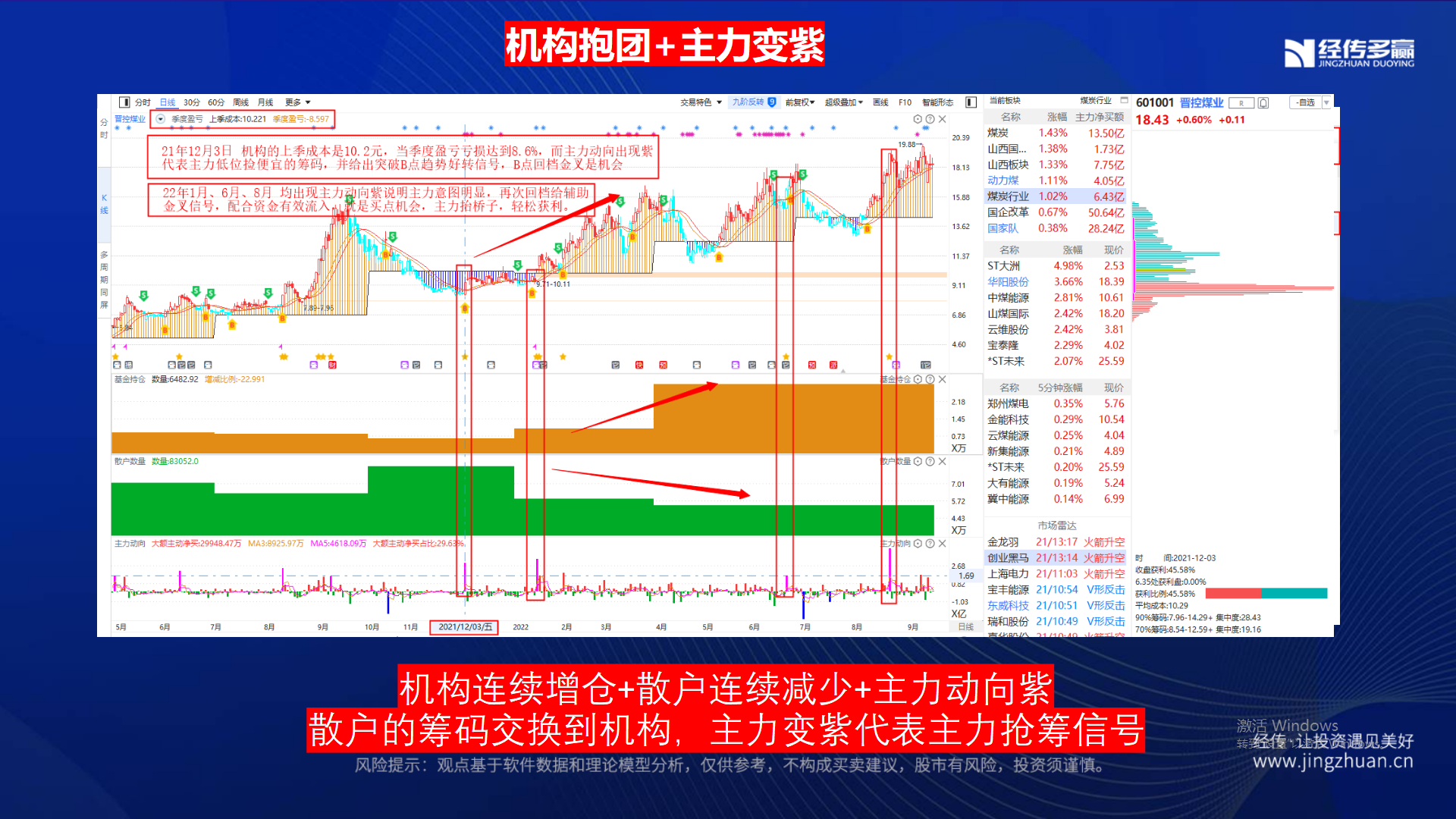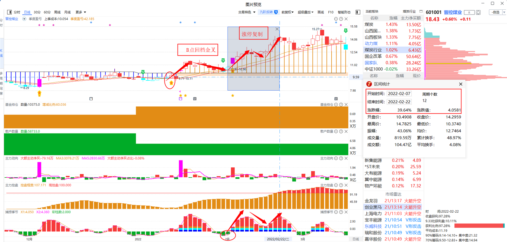 机构建仓而散户减少,说明机构和散户在互相交换筹码,机构通过打压股价等手段吸收足够的筹码,更容易走出中线拉升趋势。譬如,晋控煤业出现B点趋势启动,2022年1月17日显示主力动向变紫,代表主力意图明显抢筹,控盘相当于资金抬轿,控盘不放量,说明筹码不换手,结合控盘更稳定!B点回档金叉和涨停辅助在12个交易日涨幅高达39.6%。